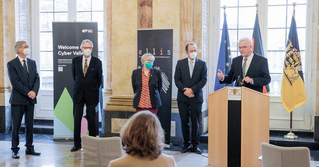 With the ELLIS institute in Tübingen, ELLIS will make an important step towards building a European Laboratory for Learning and Intelligent Systems as proposed in an open letter published by leading European AI scientists in 2018. ELLIS expects that similar institutions will be set up at other locations in due course. Baden-Württemberg's Minister-President Winfried Kretschmann, the state’s Science Minister Theresia Bauer, Dr. h.c. Hans-Werner Hector, Founder of the Hector Foundations and one of the Founders of SAP, Prof. Dr. Bernhard Schölkopf, Director at the Max Planck Institute for Intelligent Systems in Tübingen, and Prof. Dr. Bernd Engler, Director of the University of Tübingen participated in the event for the funding agreement in Stuttgart today. The state of Baden-Württemberg is contributing an additional 25 million euros and will provide the structural accommodation and administration for the ELLIS Institute.